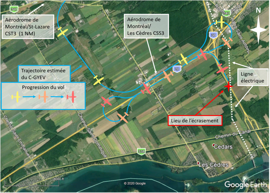 Vers 18 h 34, l’aéronef a fait un autre demi-tour pour ensuite revenir à très basse altitude au-dessus de l’autoroute 20 en direction est. Alors qu’il se trouvait à proximité de l’échangeur des autoroutes 20 et 30, il a tourné vers le sud en survolant l’autoroute 30, toujours à très basse altitude. Vers 18 h 36, l’aéronef a percuté des lignes de transport d’électricité qui traversaient l’autoroute 30 au kilomètre 7 et s’est écrasé au sol. Les 2 occupants ont subi des blessures mortelles. L’aéronef a été détruit. De nombreux appels au 911 ont été effectués par des témoins de l’accident. Les services d’urgence sont arrivés sur les lieux rapidement.