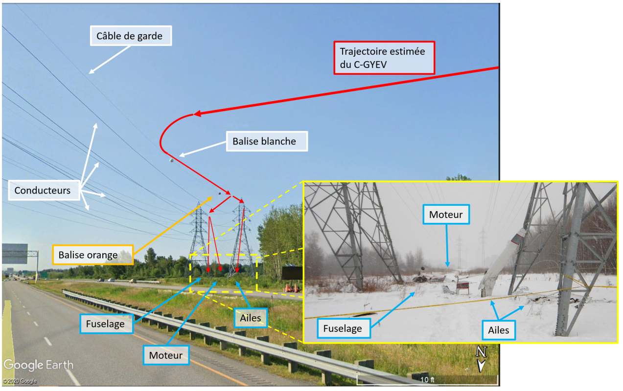 L’accident est survenu au kilomètre 7 de l’autoroute 30, à l’endroit où 2 lignes de transport d’électricité parallèles installées à environ 21,5 m (70 pieds) l’une de l’autre traversent l’autoroute. Ces 2 lignes de transport d’électricité, que l’aéronef a percutées, sont exploitées par Hydro-Québec. L’impact initial s’est produit sur le câble de gardeNote de bas de page 5 de la ligne du côté ouest. Ce câble est tendu au-dessus de l’autoroute à une hauteur ne dépassant pas 30 m (98 pieds).