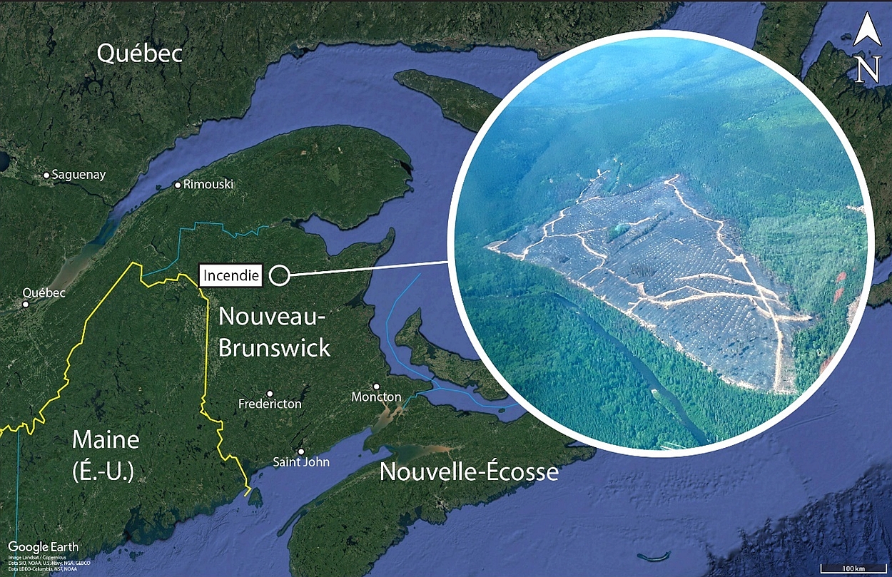 L’aéronef Bird Dog a été le premier à arriver à proximité de l’incendie. L’incendie a été localisé dans une zone d’arbres partiellement abattus, dont la superficie était d’environ 50 hectares (figure 1).