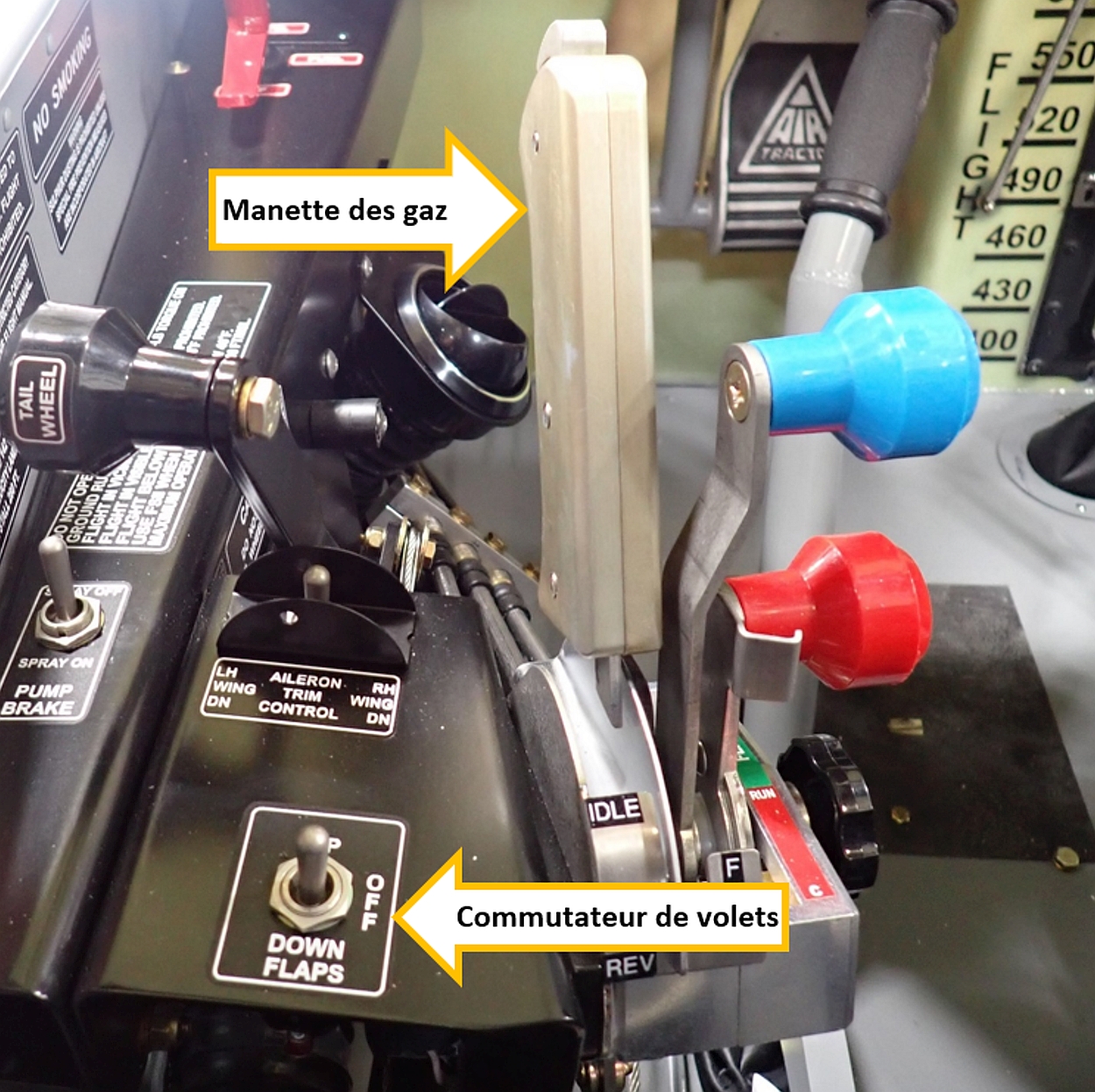 Les volets de l’AT-802 sont actionnés de manière électrique et peuvent être arrêtés dans n’importe quelle position entre celle où ils sont complètement rentrés (0°) et celle où ils sont complètement sortis (30°). Les volets sont commandés par un commutateur à ressort de rappel à sa position centrale OFF (arrêt). Le commutateur de volets est adjacent à la manette des gaz sur le côté gauche du poste de pilotage (figure 5). Le pilote doit retirer sa main de la manette des gaz pour actionner le commutateur de volets.