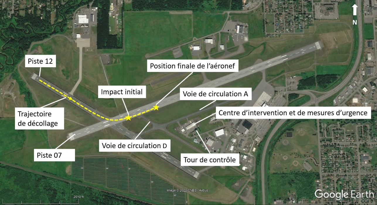 Le 16 août 2021, l’aéronef Rockwell International Aero Commander 690B (immatriculation C-GYLD, numéro de série 11426), exploité par MAG Aerospace Canada Corp. sous le numéro de vol BD160, effectuait un vol selon les règles de vol à vue entre l’aéroport de Thunder Bay (CYQT), en Ontario, et l’aéroport régional de Dryden (CYHD), en Ontario, avec le seul pilote à bord. À 21 h 09, heure avancée de l’Est, l’aéronef a amorcé un décollage sur la piste 12. Peu après le cabrage, l’aéronef s’est incliné vers la gauche, a continué son roulis puis a heurté la surface de la piste 07 dans une assiette inversée. Le pilote a subi des blessures mortelles. L’aéronef a été détruit par l’impact et l’incendie après impact. La radiobalise de repérage d’urgence s’est déclenchée à l’impact.
