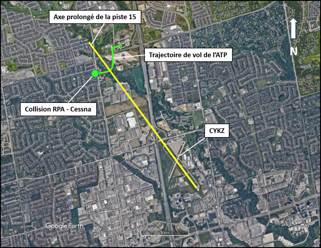 Vers 12 h 02, le personnel des opérations de la police régionale de York (York Regional Police, YRP) a demandé à l’unité de soutien aérien (Air Support Unit, ASU) de la YRP de fournir des services d’imagerie à l’aide d’un aéronef télépiloté (ATP), à l’appui d’une opération policière ayant lieu à 1,2 mille marin (NM) au nord-ouest de CYKZ, sous la trajectoire d’approche de la piste 15.