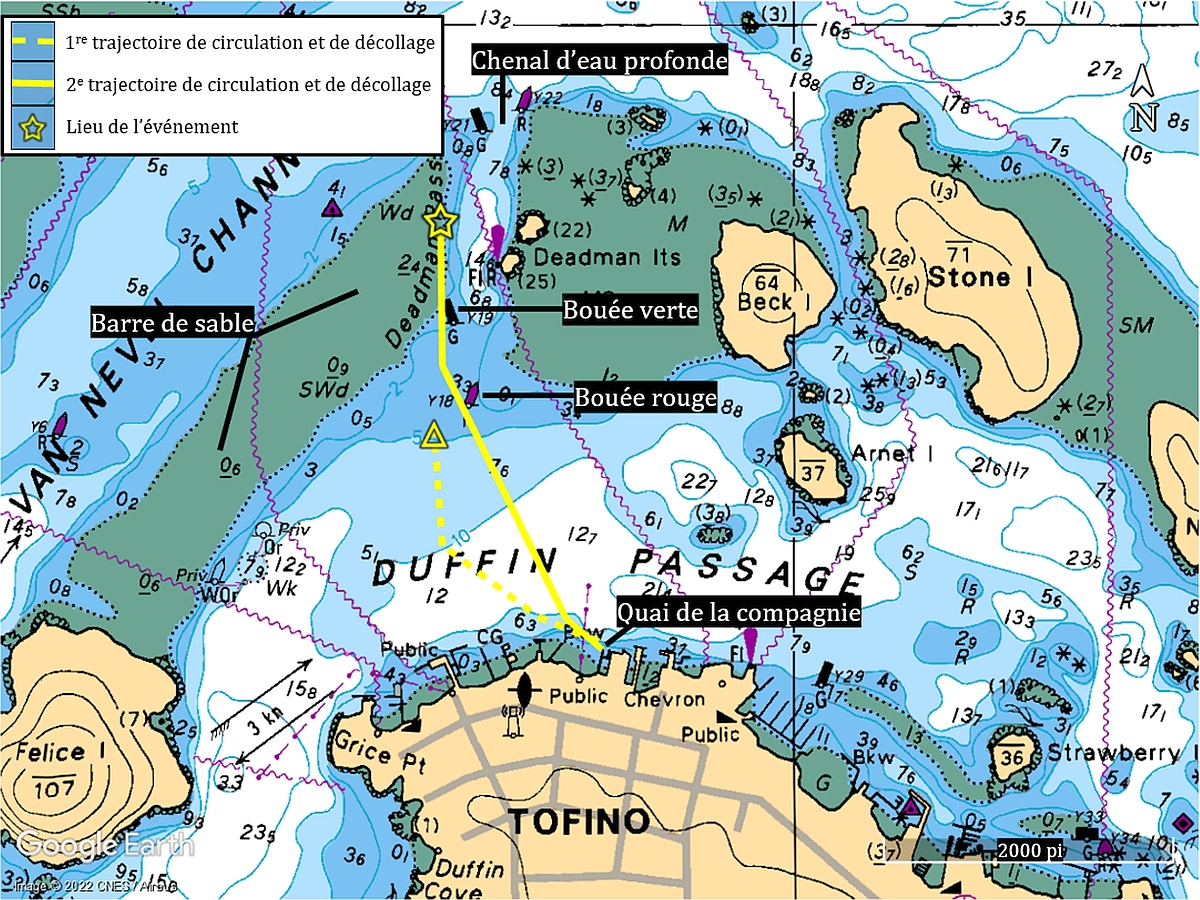 Pendant la course au décollage, l’aéronef a croisé le sillage d’un navire sur l’eau, ce qui a freiné l’accélération de l’aéronef. Le pilote a déterminé qu’une course au décollage plus longue pourrait être nécessaire et a amorcé un virage à droite sur le redan pour tenter d’atteindre le chenal d’eau profonde marqué par 2 bouées marines. À 11 h 38 min 1 s, le flotteur gauche s’est soulevé de l’eau en premier, suivi du flotteur droit, et l’aéronef a pris son envol et a maintenu le virage à droite. Il n’a pas été possible de déterminer, dans le cadre de cette enquête, si le décollage a été amorcé par un deuxième sillage de navire ou par une commande de vol.