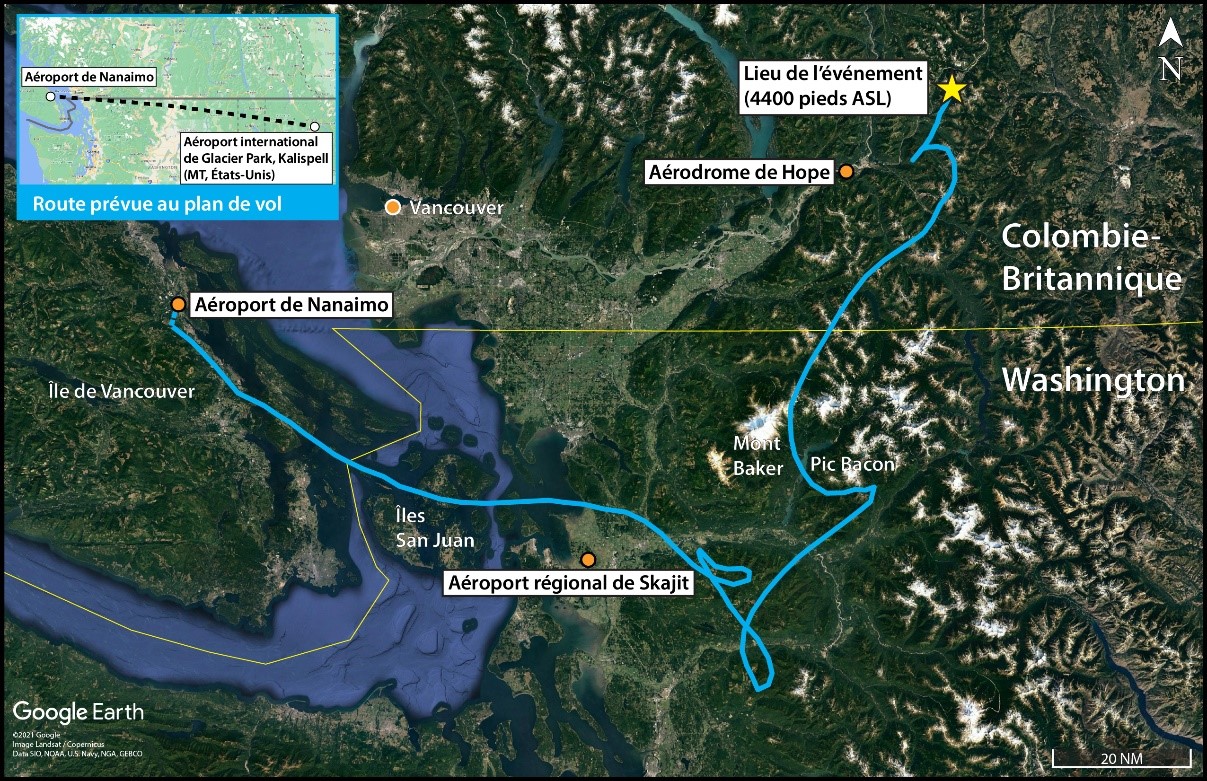 À 13 h 46Note de bas de page 1 le 15 novembre 2021, l’aéronef privé Cessna R182 (immatriculation C-FBKJ, numéro de série R18200149) est parti de l’aéroport de Nanaimo (CYCD) (Colombie-Britannique) pour effectuer un vol selon les règles de vol à vue (VFR), à destination de l’aéroport international de Glacier Park (KGPI) (Montana, États-Unis). Le pilote avait déposé un plan de vol, qui indiquait une route directe de CYCD à KGPI, effectuée à une altitude de 10 500 pieds au-dessus du niveau de la mer (ASL). Le pilote et 1 passagère étaient à bord.