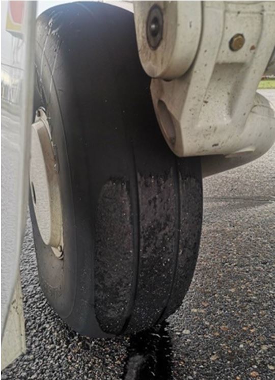 L’aéronef n’a pas été endommagé, cependant les pneus du train d’atterrissage principal présentaient des signes de réversion du caoutchouc (figures 2 et 3).