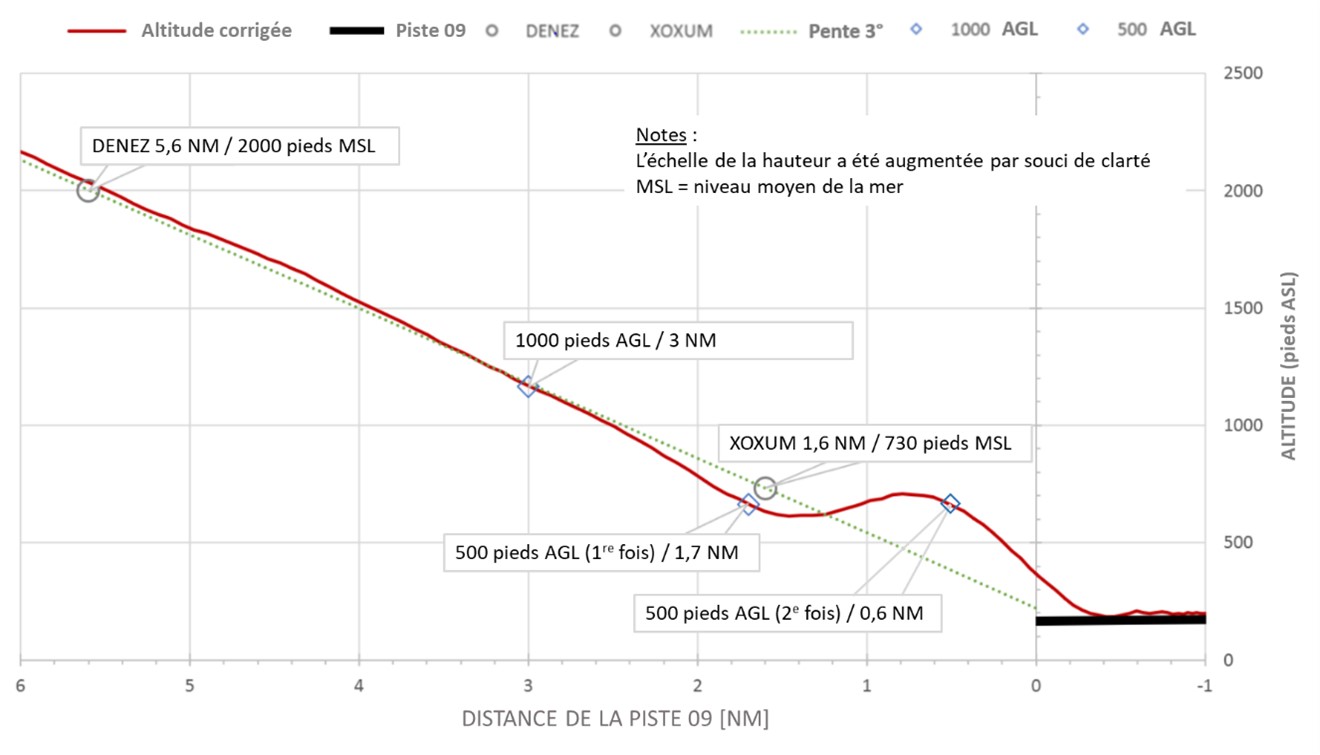 À 17 h 07 min 33 s, l’aéronef a franchi le repère d’approche finale DENEZ sur la pente d’approche de 3° à 233 KIAS.