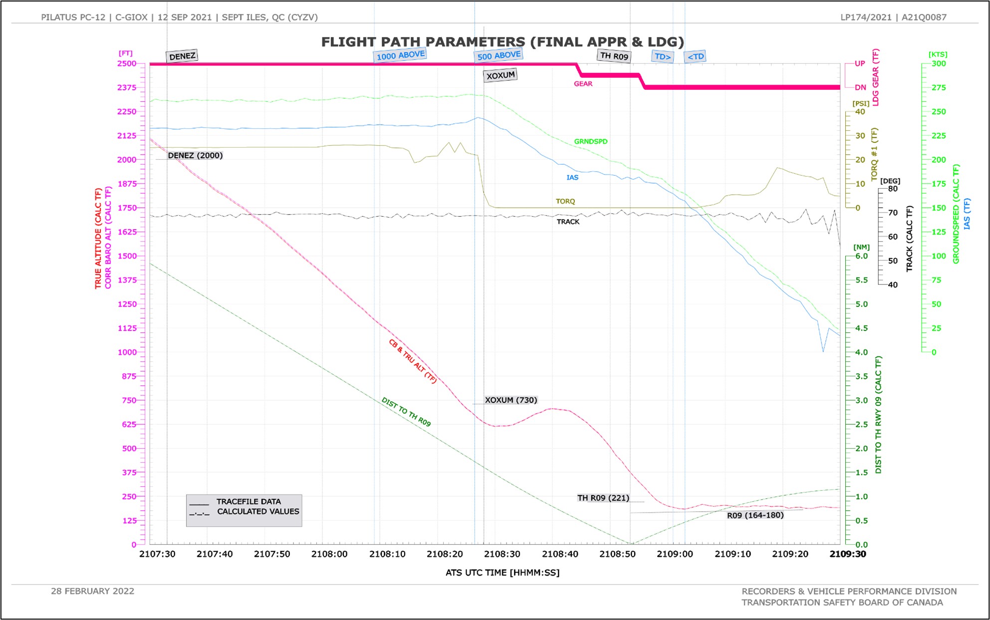 À 17 h 08 min 53 s, l’aéronef a franchi le seuil de piste à 200 pieds AGL, à 180 KIAS (vitesse sol de 191 nœuds); son taux de descente était de 2000 pi/min, le train d’atterrissage était en transit et les volets étaient entièrement rentrés.
