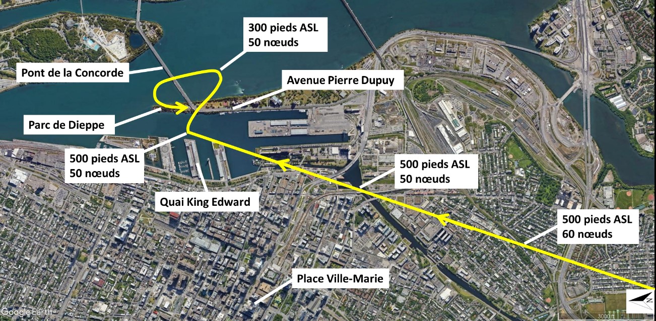 Une fois le fleuve traversé, l’aéronef a effectué un virage vers la droite pour se diriger vers le nord-nord-est. L’aéronef se trouvait encore à une altitude de 500 pieds ASL et se dirigeait vers le Vieux-Port de Montréal. Vers 17 h 59, peu après être passé par le travers de la Place Ville-Marie, l’aéronef ne pouvant monter à une altitude plus élevée, a effectué un virage vers l’est à proximité du quai King Edward afin de retourner à CML8. L’aéronef a poursuivi son vol en direction est, traversant le parc de Dieppe du côté sud du pont de la Concorde.