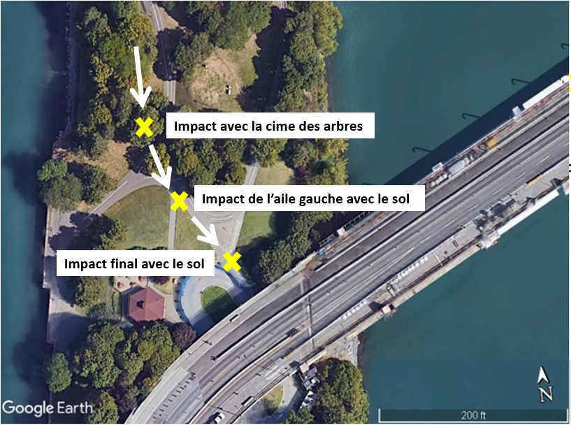 La perte de puissance est survenue lorsque l’aéronef survolait le fleuve Saint-Laurent à basse altitude. Le pilote a alors tenté de se poser sur le pont de la Concorde. Cependant, en raison des travaux de réfection sur celui-ci, il s’est retrouvé devant 2 possibilités : continuer sur une trajectoire d’atterrissage ne nécessitant que de légères corrections de cap en vue d’un amerrissage sur le fleuve ou bien tenter de poursuivre le virage afin de se poser sur l’avenue Pierre-Dupuy.