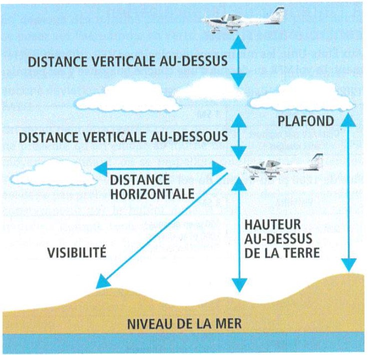 Afin de respecter les conditions météorologiques minimales pour un vol VFR dans l’espace aérien contrôlé, l’aéronef devait maintenir les distances minimales requises avec les nuages de 500 pieds sur le plan vertical et d’au moins un mille sur le plan horizontal. Cependant, lors du vol à l’étude, le pilote, qui avait planifié le vol à une altitude de 1200 pieds au-dessus du niveau de la mer (ASL), a indiqué, lors de communications avec les tours de contrôle de Montréal et de St-Hubert, qu’il attendait d’être hors des nuages afin de monter à l’altitude prévue, mais a tout de même continué de se diriger vers son point de cible, et ce, à une altitude de 500 pieds ASL.