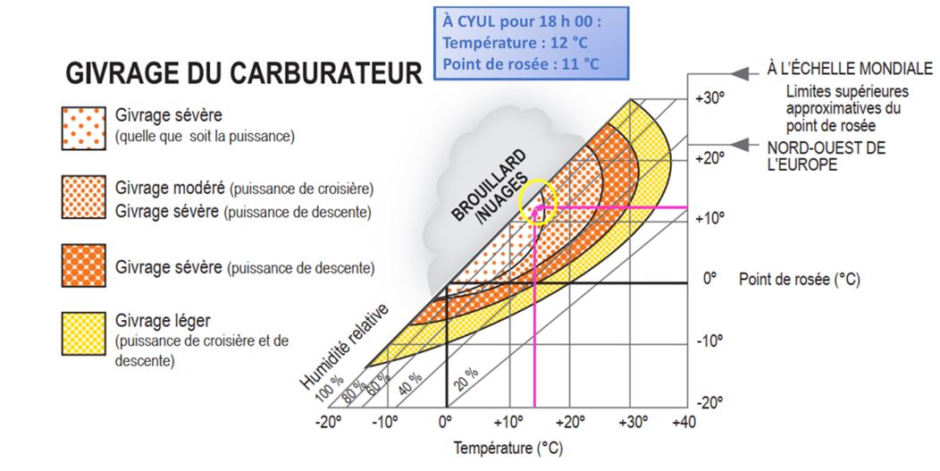 D’après le diagramme ci-dessus, la température et le point de rosée dans la région de Montréal au moment de l’événement étaient propices au givrage sévère du carburateur, et ce, quel que soit le régime moteur.