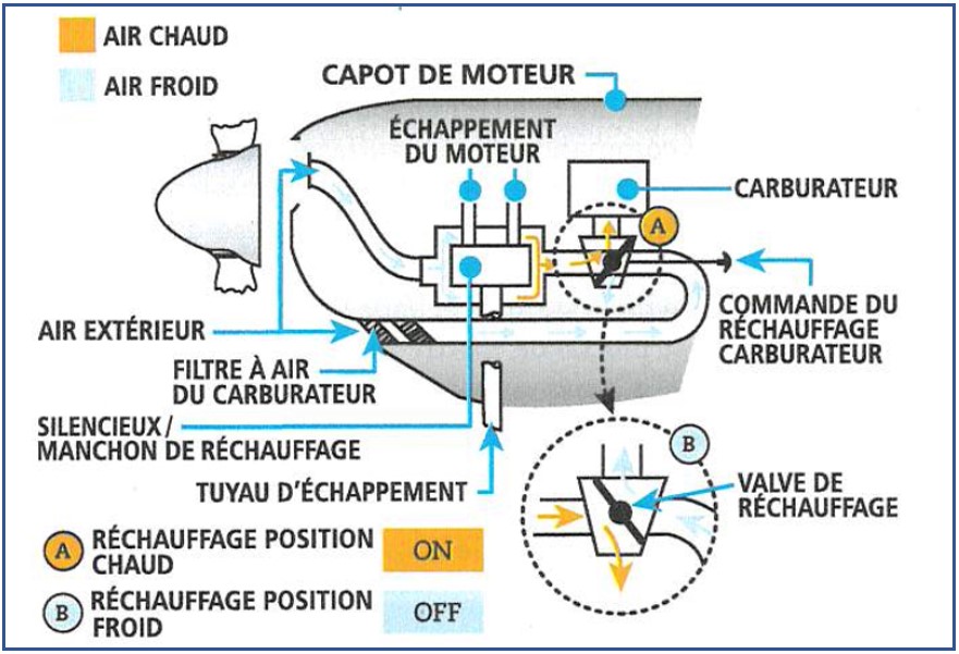 Pour éviter le givrage du carburateur, les aéronefs sont équipés d’un dispositif qui réchauffe l’air à l’admission et, ainsi empêche l’accumulation de givre. Le dispositif de réchauffage du carburateur canalise de l’air réchauffé vers la prise d’air du carburateur dans le but de maintenir le mélange air-carburant au-dessus du point de congélation et d’éviter ainsi la formation de givre dans le carburateur (figure 6). Idéalement, cette mesure est utilisée de manière préventive. Par contre, lorsque du givre s’est déjà formé dans le carburateur, le réchauffage du carburateur doit être actionné pour le faire fondre.