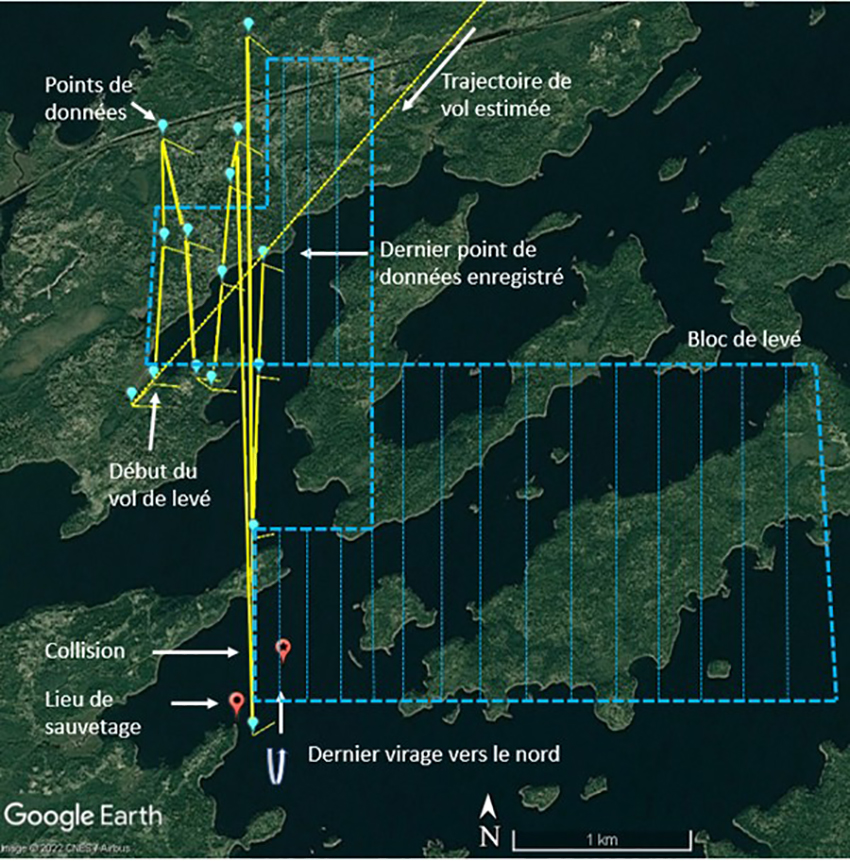 * En raison de l’espacement étroit entre les segments du levé, il est difficile d’illustrer la trajectoire de vol estimée après le dernier point de données enregistré. Toutefois, l’enquête a permis de confirmer que l’hélicoptère a continué de voler jusqu’au bord sud du bloc avant d’effectuer un virage et de se diriger vers le nord.