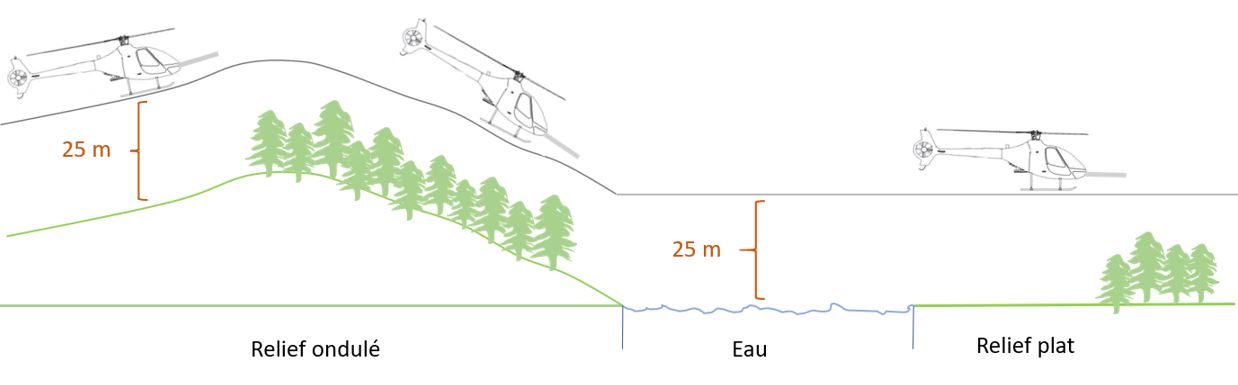 | Opérations des vols de levés | Hauteurs minimales pour les levés | S’assurer que les levés sont effectués à une hauteur sécuritaire après avoir tenu compte de tous les facteurs, y compris le relief et le type d’aéronef. | La hauteur du levé est définie comme la hauteur au-dessus du niveau de l’obstacle, comme le sommet d’un couvert forestier dans la jungle dans un environnement tropical ou le niveau du sol dans des conditions désertiques. Lorsque la hauteur du levé établie est inférieure à 100 m pour les aéronefs à voilure fixe, à 60 m pour les hélicoptères ou à 50 m pour un objet remorqué, l’approbation doit être fondée sur une évaluation des risques et approuvée par toutes les parties. |