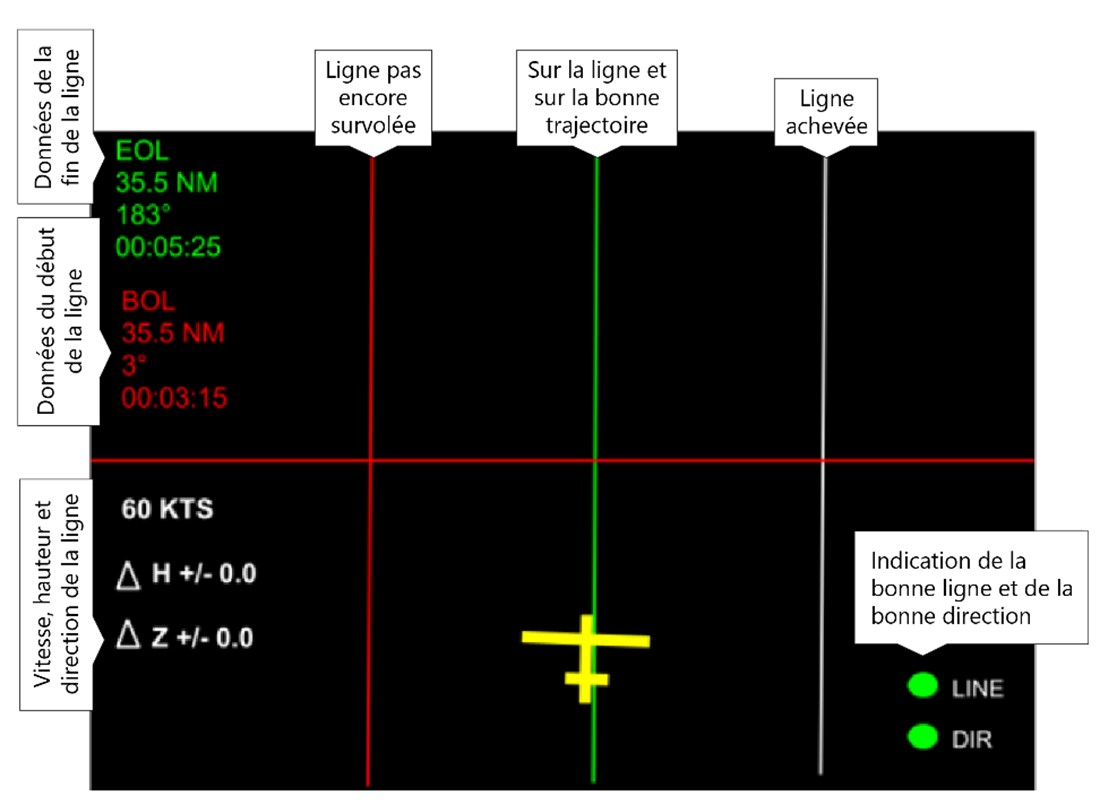 Un altimètre barométriqueNote de bas de page 9 conventionnel était le seul instrument à bord qui fournissait une indication utilisable de l’altitude de l’hélicoptèreNote de bas de page 10. Le moniteur de levé aéromagnétique de Novatem, monté à droite de la console directement devant le pilote, affichait les blocs de levé et la trajectoire de vol (figure 3).