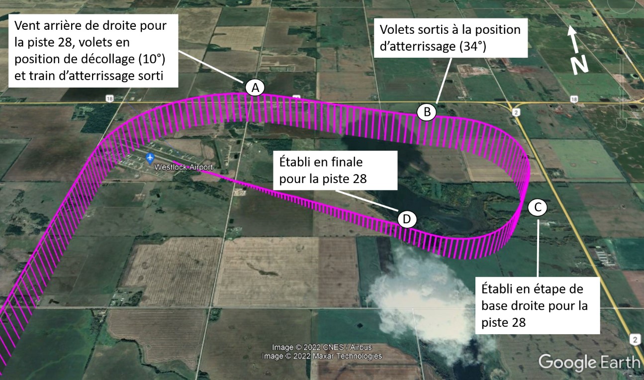 L’aéronef s’est approché de CES4 par le sud (figure 1) et, à 10 h 59 min 40 s, a survolé l’aérodrome à mi-longueur, à une altitude d’environ 1250 pieds au-dessus du sol (AGL)Note de bas de page 3 et à une vitesse indiquée de 126 nœuds (KIAS), avec le train d’atterrissage sorti et les volets réglés en position de décollage (10°)Note de bas de page 4. L’aéronef s’est ensuite incliné à droite pour rejoindre l’étape vent arrière de droite.