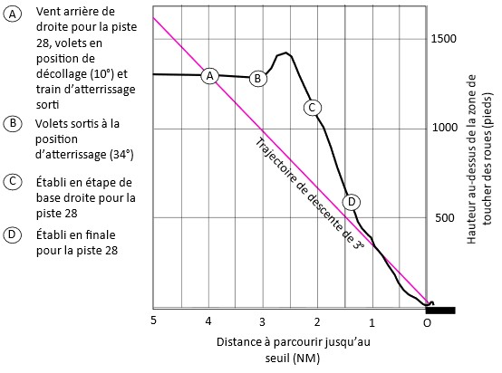 L’aéronef s’est établi en approche finale bien au-dessus de la trajectoire de descente suivant la pente optimale de 3° et, pendant l’approche à forte pente qui a suivi, la vitesse anémométrique de l’aéronef a constamment baissé, ce qui a donné lieu à une approche non stabilisée.