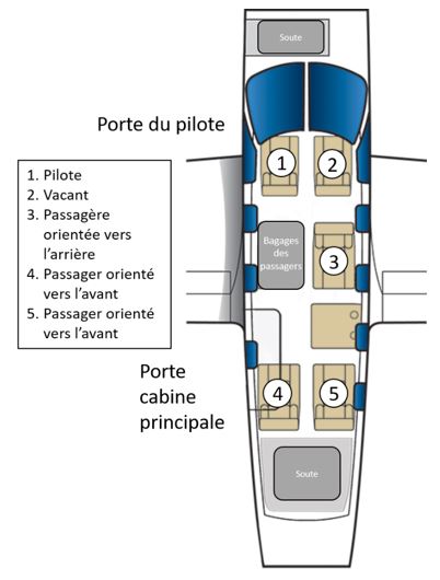 La cabine passagers de l’aéronef de l’événement à l’étude était configurée avec 3 siègesNote de bas de page 10. Cette configuration de sièges comprenait 2 sièges individuels orientés vers l’avant, situés à l’arrière de la cabine, et 1 siège passager orienté vers l’arrière, situé au milieu de la cabine, derrière le siège droit du poste de pilotage. Le 4e siège, un siège orienté vers l’arrière situé derrière le siège gauche du poste de pilotage, avait été retiré pour pouvoir accueillir une cage de voyage pour animal de compagnie et les bagages des passagers. Tous les sièges de la cabine étaient montés sur les mêmes rails que les sièges du poste de pilotage.