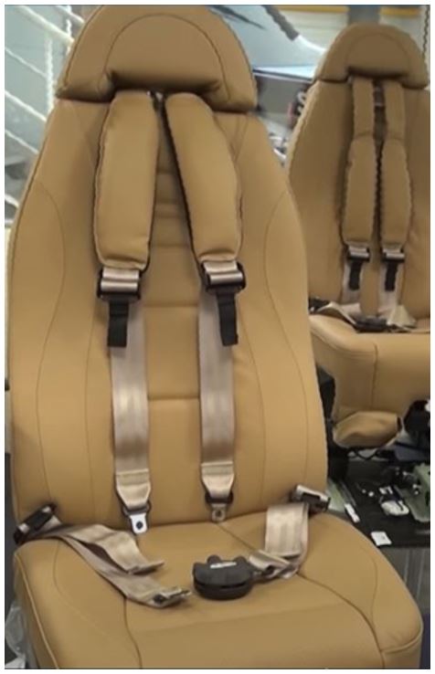 Chaque siège du poste de pilotage était muni d’un ensemble de retenue à 4 points (figure 5) composé d’une ceinture sous-abdominale réglable et d’une ceinture-baudrier à 2 sangles et à enrouleur à inertie dotées de coussins gonflables. Les coussins gonflables sont gonflés par 2 gonfleurs situés sous le carénage du dossier, qui sont activés par un accéléromètre fixé sous le panneau de plancher devant le siège. Dans les publications de Daher, les ceintures de sécurité sont désignées par le terme « seat belts » (ceintures de siège). Selon le manuel d’utilisation de l’aéronef TBM 910, [traduction] « [e]n présence de coussins gonflables, les ceintures des sièges inoccupés doivent être attachées. Il est interdit d’effectuer un vol sans attacher ces ceintures Note de bas de page 11. » La préoccupation vient du fait qu’en cas de déploiement accidentel des coussins gonflables, leur déploiement pourrait gêner le pilote dans ses manœuvres.