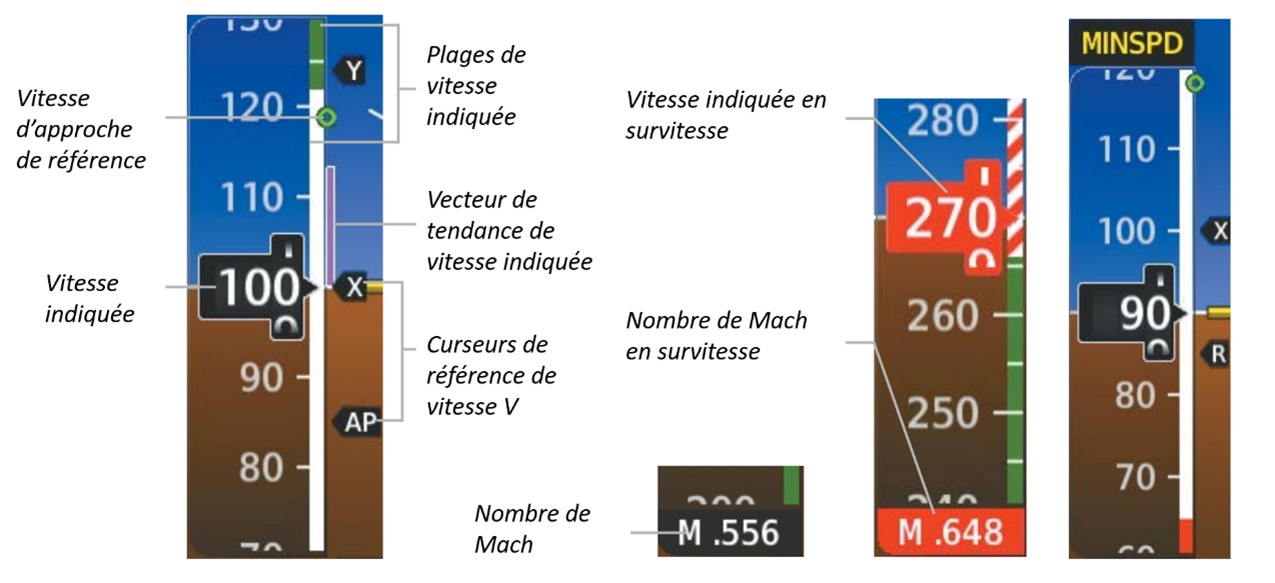 L’anémomètre de l’écran principal de vol affiche la vitesse indiquée sur une règle verticale graduée faisant défiler les vitesses (figure 6). Une bande de plages de vitesse à code de couleur (blanc, vert et hachuré rouge-blanc) est située sur la règle défilante. Les couleurs indiquent la plage d’utilisation avec volets, la plage d’exploitation normale et la vitesse maximale admissible en exploitation. En outre, il y a une plage rouge permettant d’attirer l’attention du pilote en cas de basse vitesse.