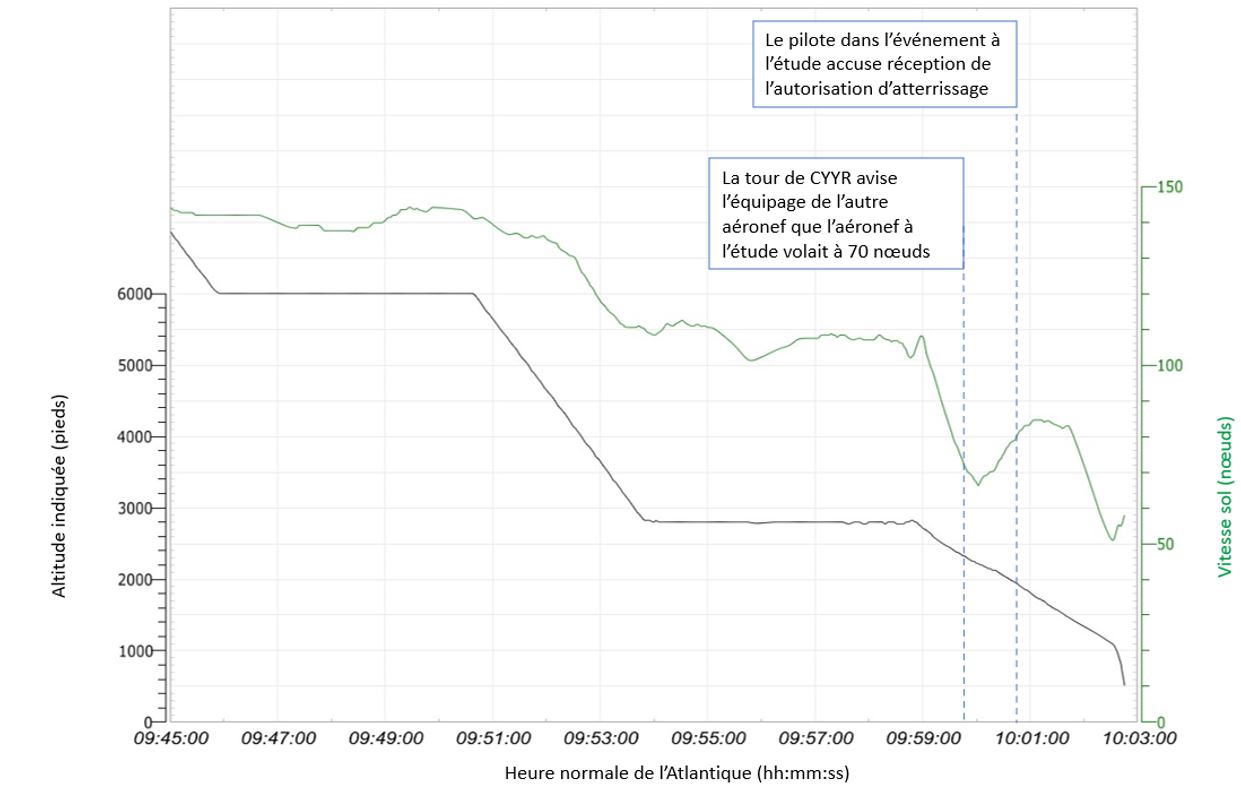 Vers 9 h 58, l’aéronef a franchi le repère d’approche finale/point de cheminement d’approche finale FAFKO à 2800 pieds ASL, à une vitesse solNote de bas de page 4 de 104 nœuds, et il a entamé la descente finale. Même si la descente a maintenu un profil constant de 3°, la vitesse sol a diminué de façon continue pendant environ 60 secondes. À 9 h 59 min 50 s, la tour de CYYR a avisé l’équipage d’un autre aéronef qu’il était deuxième pour l’approche vers la piste 08 et qu’il suivait l’aéronef à l’étude, qui se trouvait à 7 milles en finale à 70 nœuds. L’équipage de l’autre aéronef a répondu qu’il allait réduire sa vitesse. La vitesse sol de l’aéronef à l’étude, qui avait diminué pour passer à 67 nœuds, s’est mise à augmenter alors même que l’aéronef maintenait un profil d’approche constant de 3° (figure 1).