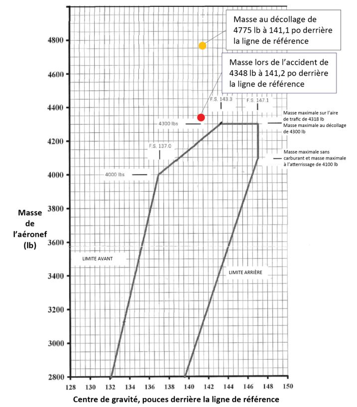 La masse maximale certifiée sur l’aire de trafic de l’aéronef à l’étude était de 4318 livres, et sa masse brute maximale au décollage était de 4300 livres, avec des limites de centre de gravité entre 143,3 et 147,1 pouces derrière la ligne de référence.