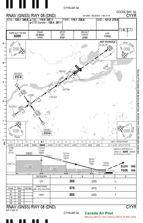 Annexe A – Approche RNAV (GNSS) RWY 08 (DND) pour l’aéroport de Goose Bay (ne doit pas être utilisée pour la navigation)