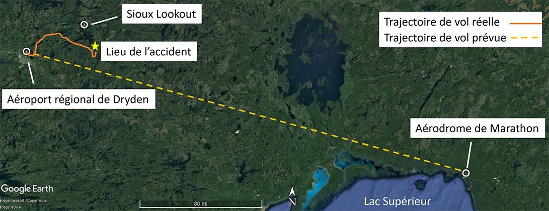 À 21 h 02Note de bas de page 1 le 29 avril 2022, le Piper Cherokee PA-28-140 (immatriculation C-GLKD, numéro de série 28-23807) a quitté l’aéroport régional de Dryden (CYHD) (Ontario) à destination de l’aérodrome de Marathon (CYSP) (Ontario), avec à son bord 1 pilote et 3 passagers. On a signalé le retard de l’aéronef à 1 h 39 le 30 avril 2022. L’aéronef avait été observé pour la dernière fois sur le radar à 21 h 45Note de bas de page 2, volant en zigzag au-dessus d’une région qui offre peu d’éclairage artificiel (figure 1). Des recherches ont été entreprises, et l’épave a été retrouvée à environ 19 milles marins au sud-sud-est de l’aéroport de Sioux Lookout (CYXL) (Ontario). L’aéronef avait percuté le relief dans une zone boisée pendant les heures d’obscurité. Le pilote et les 3 passagers ont été mortellement blessés. L’aéronef a été détruit. La radiobalise de repérage d’urgence (ELT)Note de bas de page 3 s’est déclenchée au moment de l’impact, et le signal a aidé les services de recherche et sauvetage à repérer le lieu de l’accident.