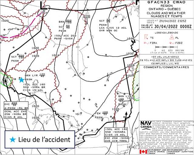 La prévision de zone graphique pour le secteur aux alentours de CYHD et CYXL, émise à 18 h 25 le 29 avril et valide à 19 h, indiquaient des couches de nuages fragmentés dont la base se situait à 4000 pieds au-dessus du niveau de la mer (ASL), et le sommet, à 12 000 pieds ASL, une visibilité supérieure à 6 milles terrestres (SM), des nuages altocumulus castellanus isolés avec des sommets à 16 000 pieds ASL avec une visibilité de 5 SM dans de légères averses de pluie et du brouillard, et enfin des plafonds de 1500 pieds au-dessus du sol (AGL) (figure 2).
