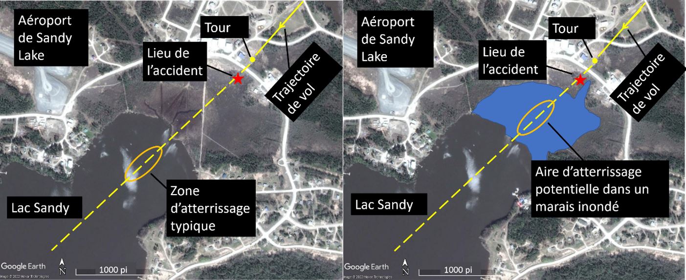 Au moment de l’événement, le niveau d’eau du lac Sandy était plus élevé que la normale en raison d’une fonte des neiges plus importante que la normale et d’un printemps pluvieux. Par conséquent, la zone normalement marécageuse au nord-est de l’aire d’atterrissage était entièrement submergée (figure 1). L’élévation normale du lac est de 901 pieds au-dessus du niveau de la mer (ASL).