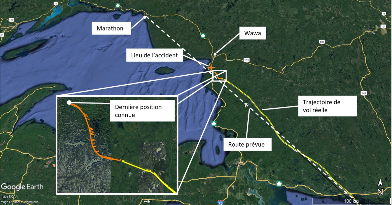 D’après les données de surveillance dépendante automatique en mode diffusion (ADS-B) obtenues après l’événement, l’aéronef volait en direction de CYSP vers 17 h 58, mais commençait à changer de cap plus fréquemment. Les renseignements sur la position ADS-B ont été perdus vers 18 h 03, alors que l’aéronef se trouvait à environ 14 milles marins (NM) au sud de l’aérodrome de Wawa (CYXZ) (Ontario) et que les conditions météorologiques se détérioraient, passant de VMC à des conditions météorologiques de vol aux instruments (IMC).