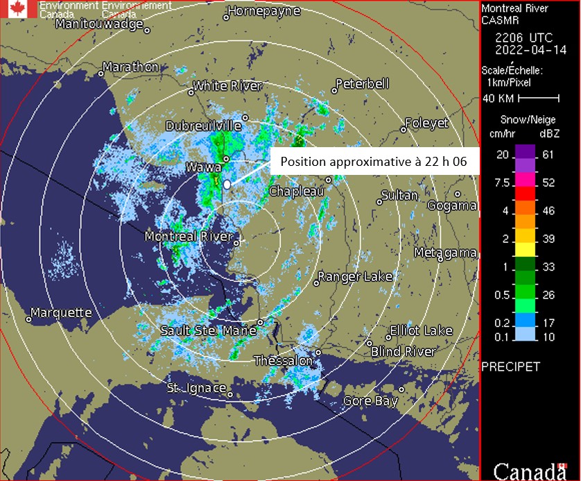 Le radar météorologique d’Environnement et Changement climatique Canada a montré des précipitations de neige se déplaçant sur la zone de l’événement du sud-ouest au moment où la dernière position connue a été enregistrée (figure 2).