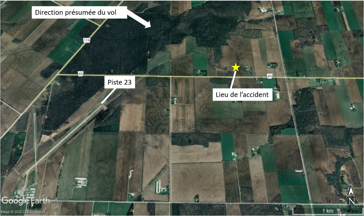 Vers 9 h 10, l’aéronef a été aperçu volant dans des conditions de visibilité réduite, entrant dans des zones de couverture nuageuse basse et en sortant avec un angle d’inclinaison prononcé à droite. L’aéronef a ensuite disparu de la vue et, quelques secondes plus tard, on a entendu un bruit d’impact. Bien que personne n’ait vu l’impact comme tel, des observateurs ont aperçu, depuis un champ voisin, de la fumée provenant de l’incendie et ont appelé le 911. L’aéronef s’était écrasé dans un champ cultivé, à 1,3 mille marin (NM) à l’est-nord-est du seuil de la piste 23 (figure 1). L’aéronef a été détruit par un important incendie qui s’est déclaré après l’impact. Le pilote a été mortellement blessé.