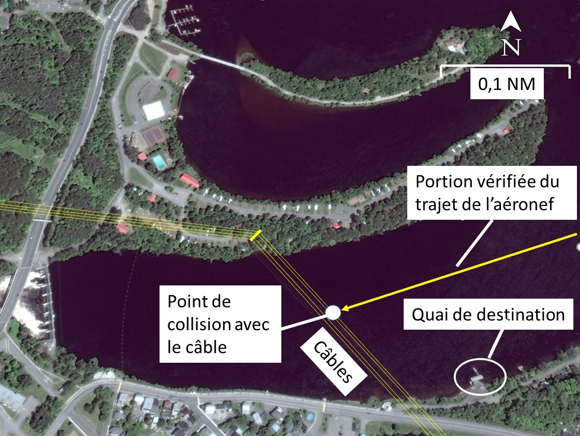 L’accident est survenu sur la rivière Saint-Maurice à Shawinigan, non loin du quai de destination, à l’endroit où une ligne de transport d’électricité d’Hydro-Québec, située à 3,5 NM à l’ouest d’un barrage électrique, enjambe la rivière. Lors du survol de son lieu d’amerrissage, l’aéronef a percuté le câble inférieur de cette ligne (figure 1).