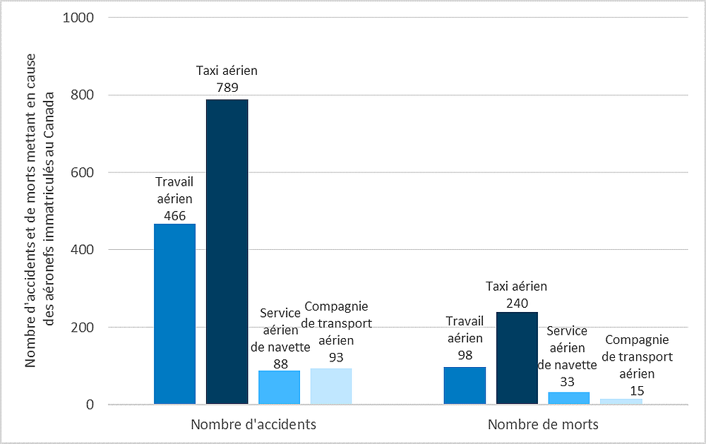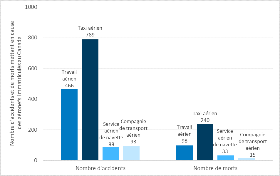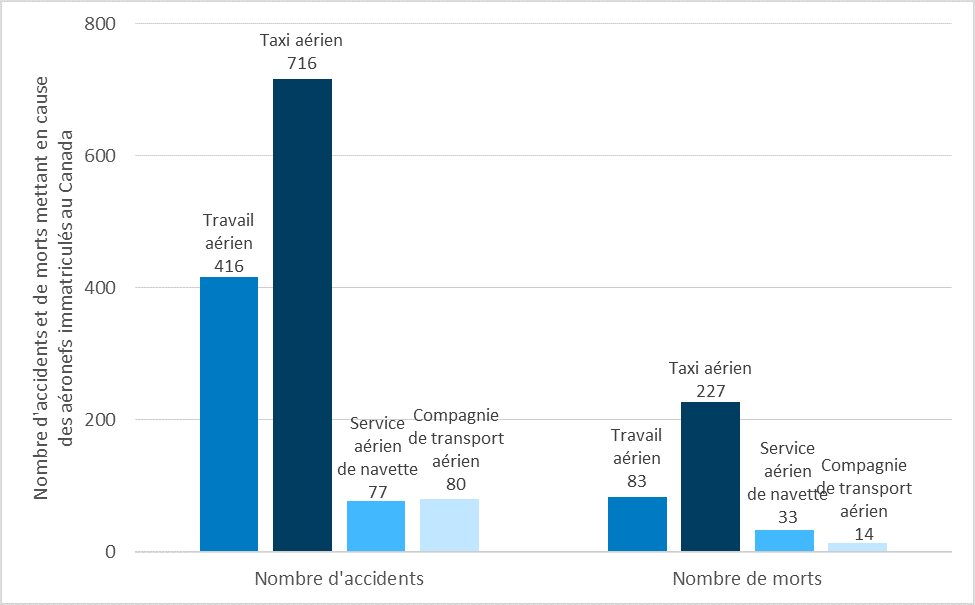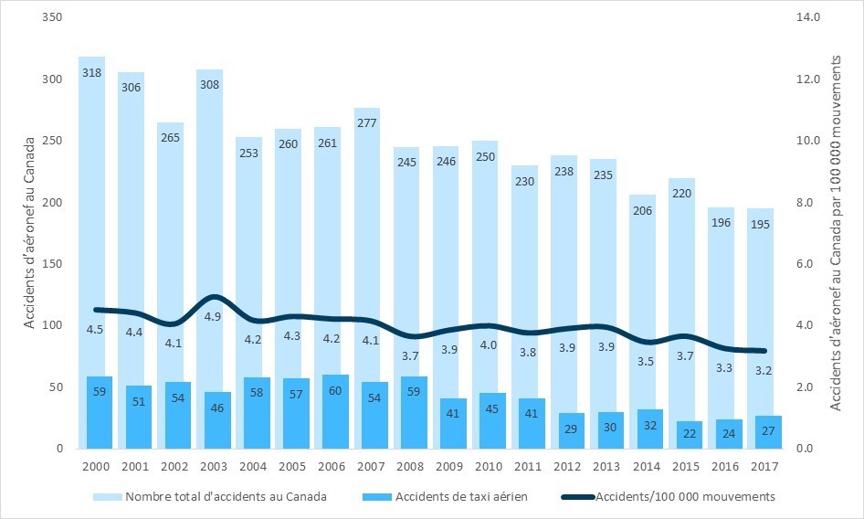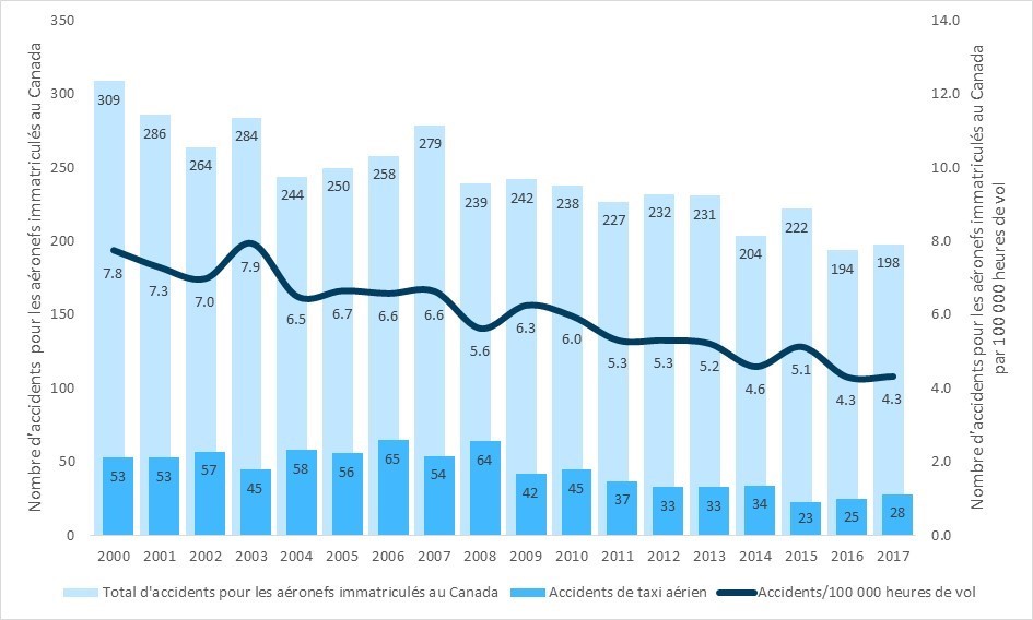 Comme le gouvernement ne classe pas les données qu'il recueille sur les heures de vol et les mouvements par sous-partie du RAC, les données des taux calculés s'appliquent au secteur de l'aviation commerciale dans son ensemble. Aucune distinction n'est faite entre les secteurs (p. ex., exploitant de taxi aérien et compagnie de transport aérien) ou entre les différents types d'aéronefs (avion, hélicoptère, hydravion). Par conséquent, il est impossible de calculer le taux d'accidents uniquement pour le secteur du taxi aérien.