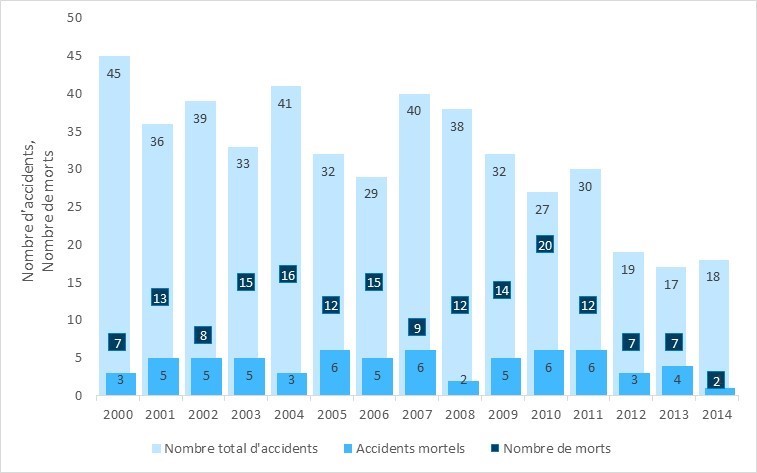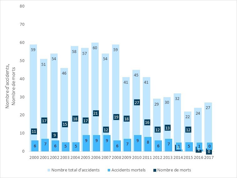 Il y a davantage d'accidents et davantage de pertes de vie dans le secteur du taxi aérien que dans tous les autres secteurs de l'aviation commerciale au Canada. Les chiffres sont clairs. Au cours des 18 années entre le 1er janvier 2000 et le 31 décembre 2017, on a recensé 789 accidents de taxi aérien qui ont fait au total 240 morts. Cela correspond à 55 % des accidents et 62 % des pertes de vie qui ont eu lieu pendant cette période dans l'aviation commerciale au Canada (figure S1).