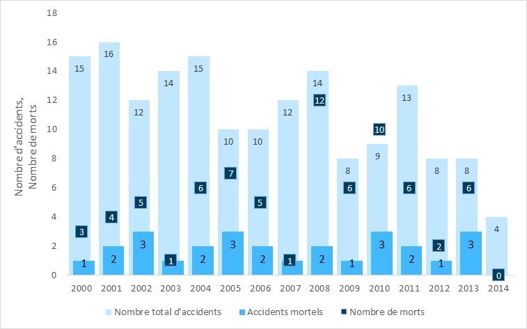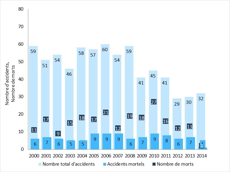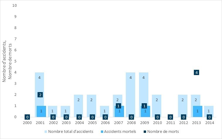 Dans la même période, dans le transport aérien au CanadaNote de bas de page 2, il n'y a eu que 93 accidents (6 % du total) et 15 pertes de vie (4 % du total).