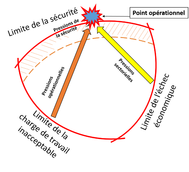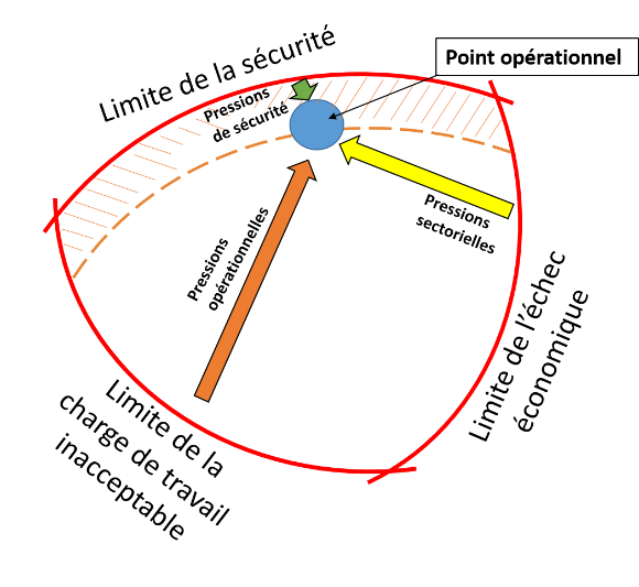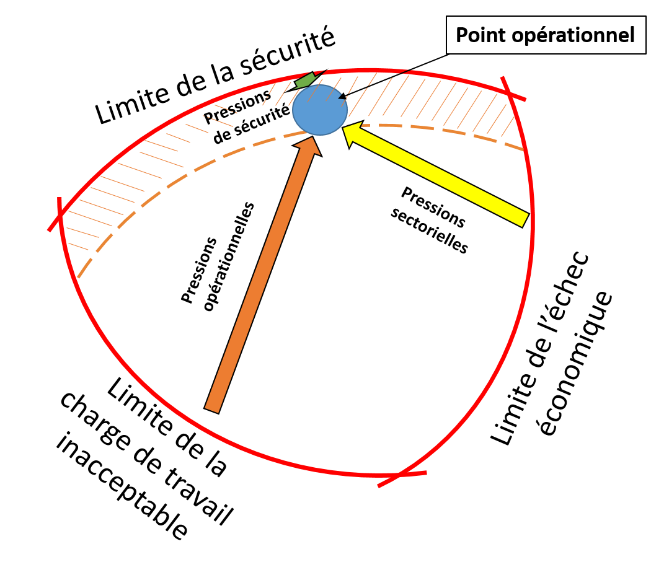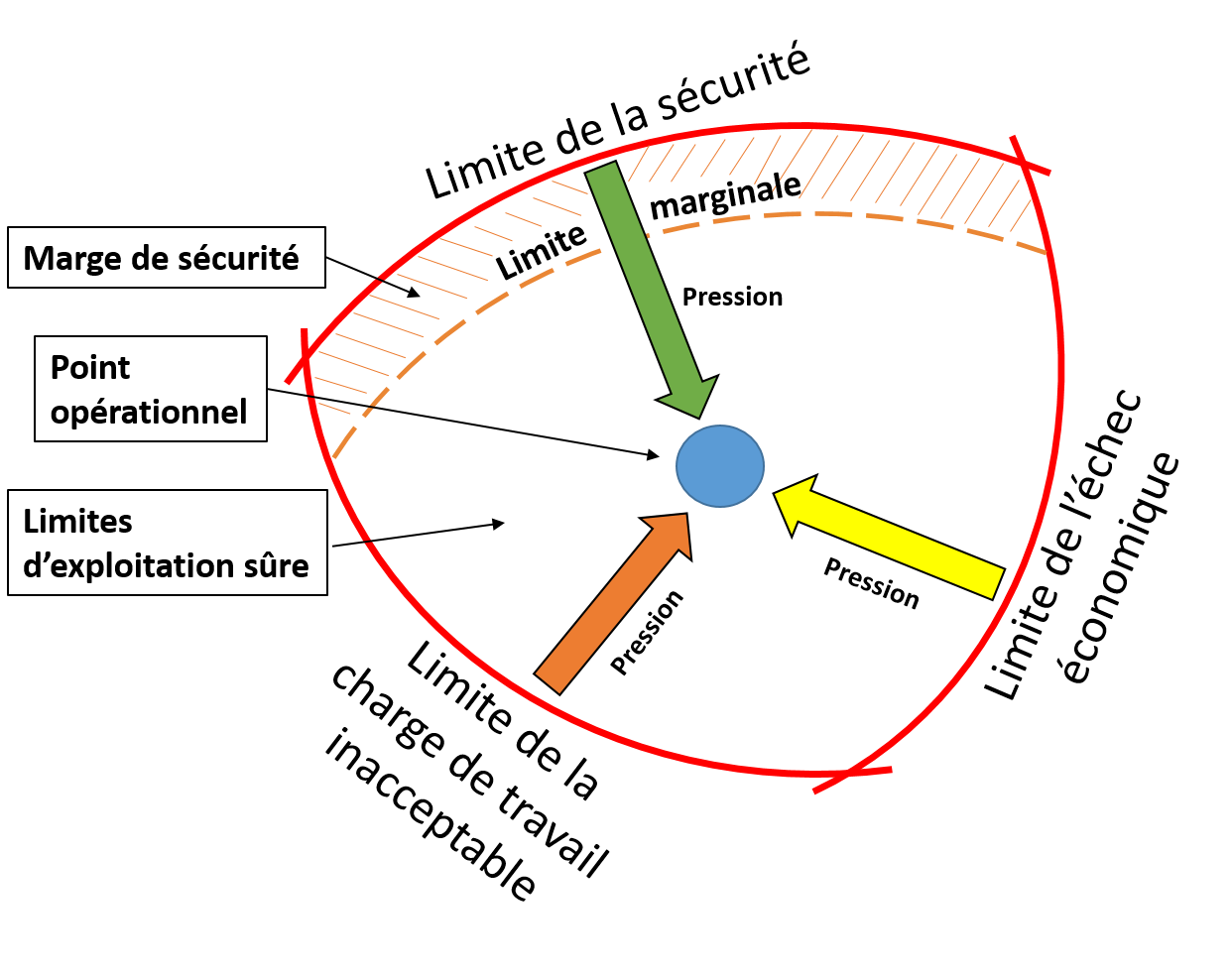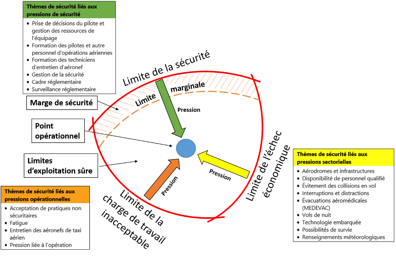 Dans ce modèle, le secteur du taxi aérien (ou un exploitant individuel) est représenté par le point opérationnel (cercle bleu). La façon dont l'exploitant ou le secteur d'activité gère les dangers ou les risques inhérents détermine la position du point opérationnel. Le point opérationnel est en mouvement constant. Il y a échec du système si ce point traverse une des limites du domaine d'exploitation sécuritaire. Ces limites sont les suivantes :