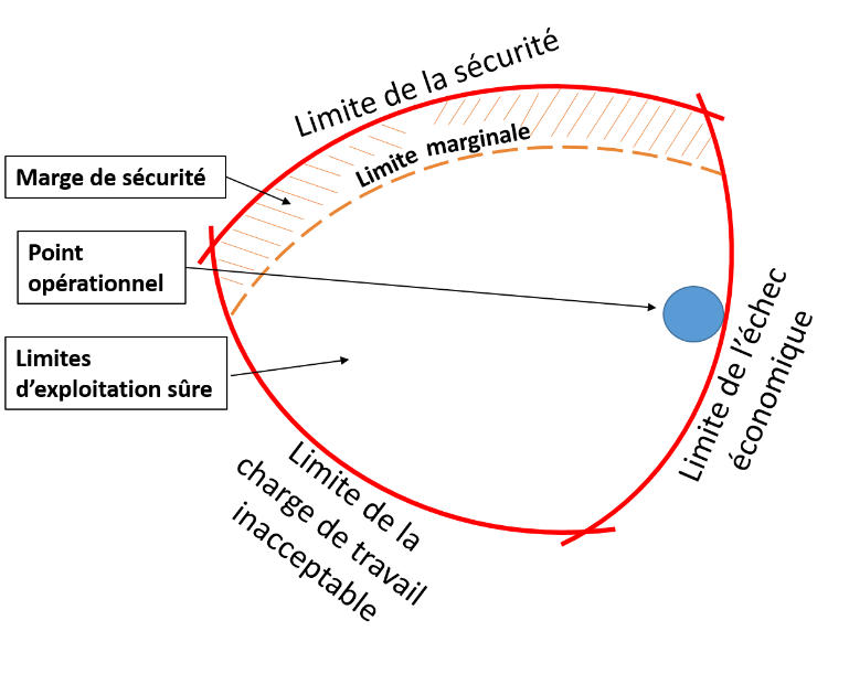 La limite marginale indique la profondeur de la marge de sécurité : plus les mécanismes de défense sont fragiles ou rares, plus la marge de sécurité est mince. Si le point opérationnel traverse la limite marginale, la sécurité de l'activité diminue; puis, si le point opérationnel traverse la limite de la sécurité, il y aura échec (un accident ou incident).
