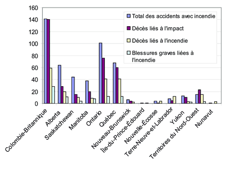 Le nombre d'accidents avec incendie varie grandement d'une province à l'autre, la Colombie-Britannique comptant quelque 27 % du nombre total d'accidents. Le taux d'accidents dans une région et le relief sont deux facteurs qui semblent avoir une influence sur le nombre d'accidents avec incendie dans la région. Le relief montagneux de la Colombie-Britannique est un facteur contributif au taux d'accidents de petit aéronef plus élevé, et ce, à cause des risques opérationnels plus élevés inhérents au vol à vue (VFR) à basse altitude en montagne. Les accidents en montagne semblent entraîner des incendies plus fréquents et avoir une fréquence plus élevée de décès liés à l'impact, que l'accident soit suivi ou non d'un incendie. Ce phénomène est probablement dû aux accidents plus violents en terrain accidenté.