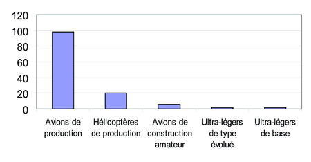 La base de données du SISA renferme des dossiers portant sur 13 806 accidents de petit aéronef survenus au Canada entre 1976 et 2002. Ces accidents concernent tous les types d'aéronefs utilisés en exploitation commerciale et privée, comme des avions de production Note de bas de page 8 et de construction amateur, des hélicoptères de production et de construction amateur, ainsi que des ultra-légers de base et de type évolué. Le suivi exercé dans le cadre de l'enquête A00W0109 a permis au BST de dénombrer 521 accidents avec incendie, ce qui représente 3,8 % de l'ensemble des accidents.