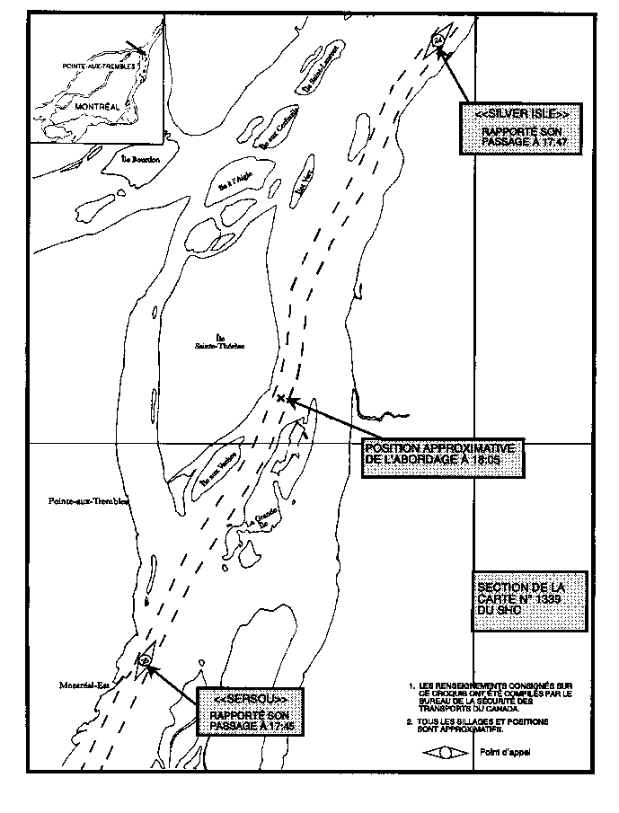 Le «SILVER ISLE» avait la carte du Service hydrographique du Canada (SHC) no 1352 qui couvre le secteur où l'abordage s'est produit. L'équipage utilisait toutefois la carte no 1339 qui est à plus petite échelle. Le «SERSOU» avait, lui aussi, la carte no 1352 du SHC, mais l'équipage se servait de la carte no 422 de l'Amirauté britannique qui est une carte à petite échelle utilisée habituellement lors de la planification de voyages.