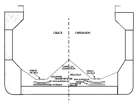...longitudinalement sous les cales à cargaison, dans un tunnel coiffé d'un silo (voir la vue en coupe du milieu du navire à l'annexe A). Un système de convoyeurs à boucles placé à l'extrémité arrière du tunnel dans un puits vertical situé sur l'axe longitudinal du navire dessert un mât de déchargement tournant qui se trouve sur le pont principal. Sous le silo, le tunnel est accessible de l'avant ou de l'arrière.