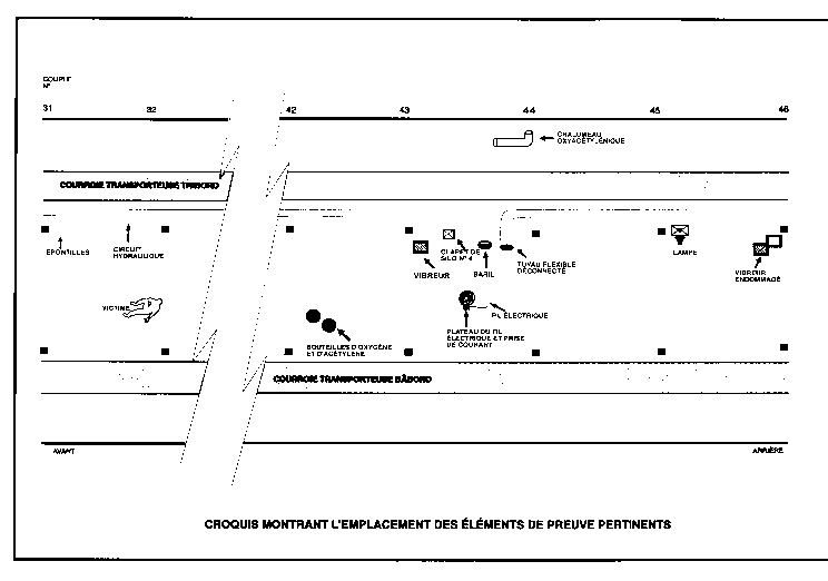 - La zone la plus endommagée par le feu se trouvait dans la partie avant du tunnel du côté tribord du tunnel central, à l'extrémité arrière du silo no 4 sous la cale no 1. Les membrures verticales 46 et 49 avaient été gauchies par la chaleur et la courroie transporteuse en caoutchouc était calcinée sur une longueur de 35 m.