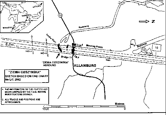 Pendant que le pontier était en train d'abaisser le pont, il a aperçu le «ZIEMIA CIESZYNSKA» qui se trouvait à une soixantaine de mètres et dont l'arrière se déplaçait rapidement vers l'est. Il a estimé que l'avant du navire faisait un angle de 45 à 50 degrés par rapport à l'axe du chenal en direction de la rive ouest, près d'une bouée à espar. Le navire s'est échoué à 0 h 14, par 43°04′24"N et 079°12′36"W.