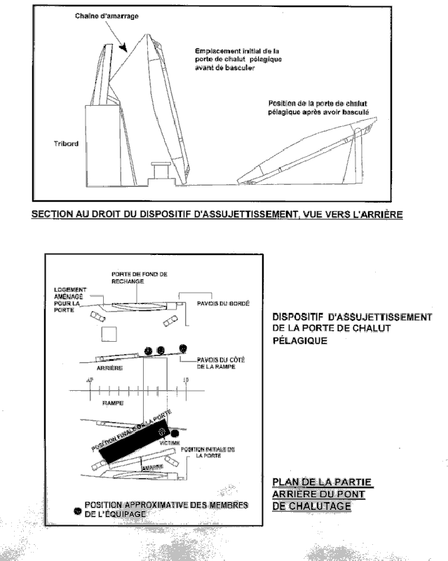 - Les opérations normales du navire obligeaient les membres de l'équipage à travailler près des panneaux de chalut arrimés.