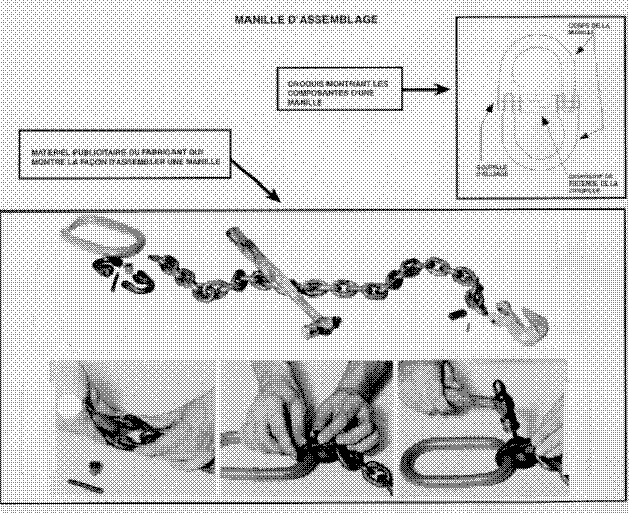 Les manilles d'assemblage sont utilisées couramment à bord des bateaux de pêche, car elles sont un moyen rapide et efficace pour relier deux chaînes entre elles ou pour relier une chaîne à des points d'ancrage ou à d'autres pièces telles que des crocs. Une manille d'assemblage ressemble à un maillon de chaîne à étai et se compose de deux pièces forgées semi-circulaires et symétriques, reliées par une goupille d'alliage, laquelle est retenue en place par un étai. Pour assembler la manille, on enfonce la goupille dans l'étai une fois toutes les pièces en place. Les pièces de la manille restent en place en raison de l'ajustement serré de la goupille à l'intérieur de l'étai. Il incombe à l'utilisateur de remplacer une manille d'assemblage lorsque l'ajustement se relâche. D'après les éléments de preuve recueillis, il ne serait pas inhabituel de remplacer au moins une douzaine de manilles d'assemblage au cours d'une sortie de pêche typique.