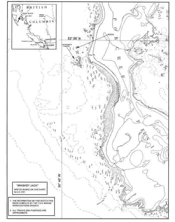 Le 11 mai 1993, le bateau de pêche «WHISKEY JACK», qui faisait la récolte de fruits de mer, était mouillé sur des hauts-fonds au large de l'île Fan, péninsule de Porcher (Colombie-Britannique). Alors que le navire, lourdement chargé, était en train de lever l'ancre, une série de grosses lames s'est abattue sur sa hanche bâbord. Le «WHISKEY JACK» a alors embarqué de grandes quantités d'eau qui l'ont fait s'enfoncer rapidement sur l'arrière, et il a coulé. Un des trois membres de l'équipage a succombé à l'hypothermie et s'est noyé, tandis que les deux autres ont été recueillis, souffrant eux aussi d'hypothermie.