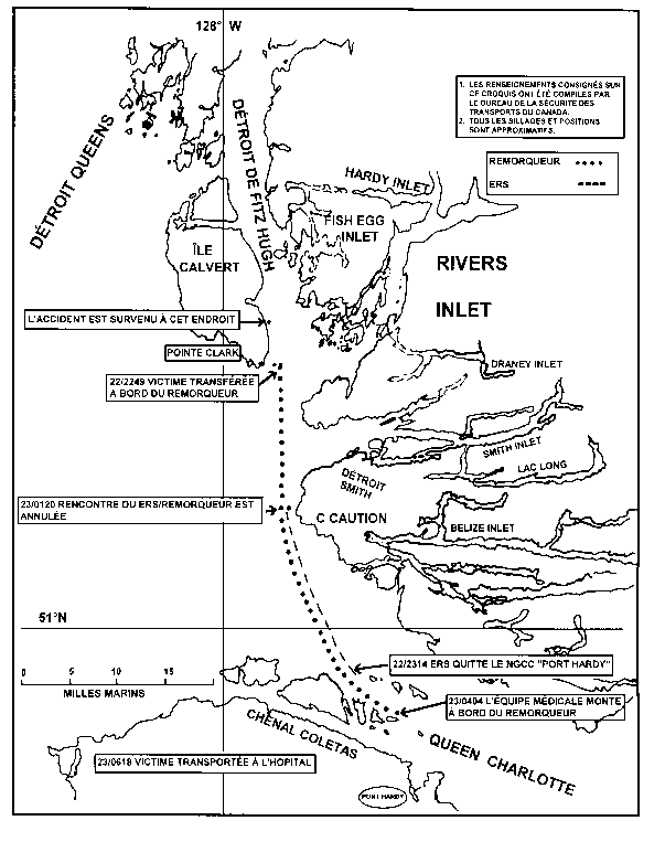 Normalement, c'est le NGCC «GORDON REID», d'une longueur de 50 m, qui aurait patrouillé le détroit de la Reine-Charlotte, mais comme il était en radoubs à Victoria, on a dû confier l'opération de recherches et sauvetage (SAR) à l'embarcation de sauvetage «PORT HARDY», qui mesure 13 m et a un faible tirant d'eau. Cette embarcation atteint une vitesse maximale de 10 noeuds par beau temps.