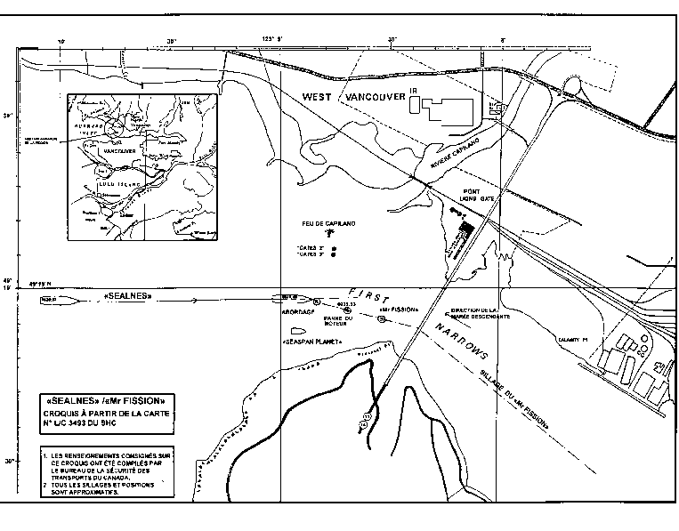 Peu après minuit le 19 décembre 1993, par bonne visibilité, le «SEALNES» qui approchait du First Narrows, en route pour le port de Vancouver, a été mis en cause dans un abordage avec le «MR. FISSION» qui dérivait dans le chenal principal, victime d'une panne moteur. Les trois membres de l'équipage du «MR. FISSION» ont été promptement secourus par un des remorqueurs qui se trouvaient dans le secteur avant que leur navire chaviré ne coule.